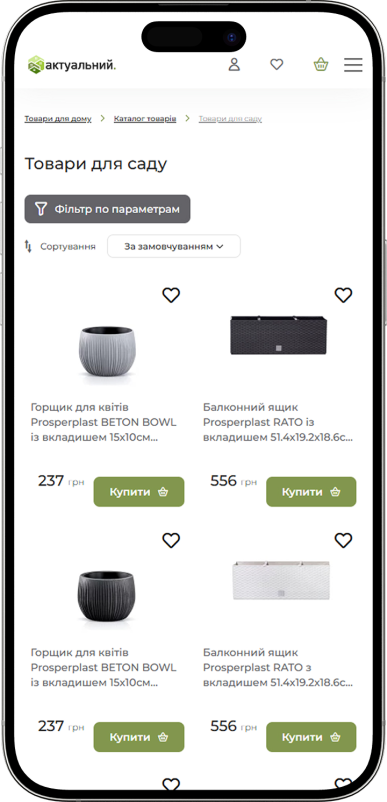 В каталоге реализована открытая система фильтрации товаров, обеспечивающая быстрый и удобный подбор продукции по ключевым параметрам. Визуальные акценты сделаны на крупных, детализированных фотографиях товаров, а дополнительная навигация по категориям упрощает поиск нужных позиций. Также в рамках проекта внедрены модули группировки товаров, которые способствуют росту конверсии за счёт быстрого доступа к релевантным предложениям и полного покрытия основных потребностей клиентов.