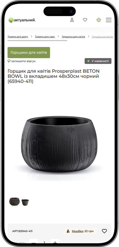 Продуманная «воздушная» компоновка элементов карточки товара позволяет пользователю сосредоточиться на ключевых аспектах выбора: крупных фотографиях продукции, доступных вариантах комплектации, наглядном отображении наличия товара и возможности получения кешбэка с каждой покупки. Дополнительно в рамках проекта реализован функционал оптовых заказов, который расширяет пользовательские сценарии, повышает заинтересованность аудитории и положительно влияет на общий уровень конверсии интернет-магазина.